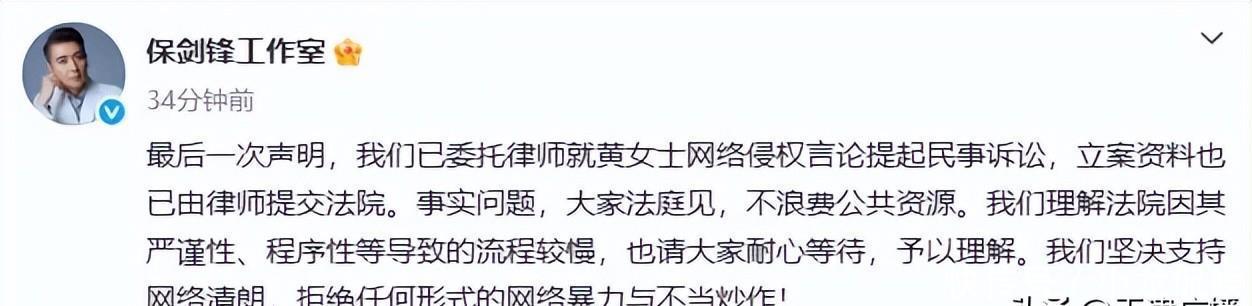 当天下午,保剑锋工作室发文回应:最后一次声明,我们已委托律师就黄女士网络侵权言论提起民事诉讼,立案资料也已由律师提交法院。事实问题,大家法庭见,不浪费公共资源。我们理解法院因其严谨性、程序性等导致的流程较慢,也请大家耐心等待,予以理解。我们坚决支持网络清朗,拒绝任何形式的网络暴力与不当炒作!
